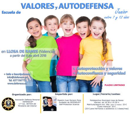 DEFENSUS® Junior es nuestro programa específico orientado a la formación de niños/as (entre 7 y 12-13 años) en VALORES éticos y AUTOPROTECCIÓN.